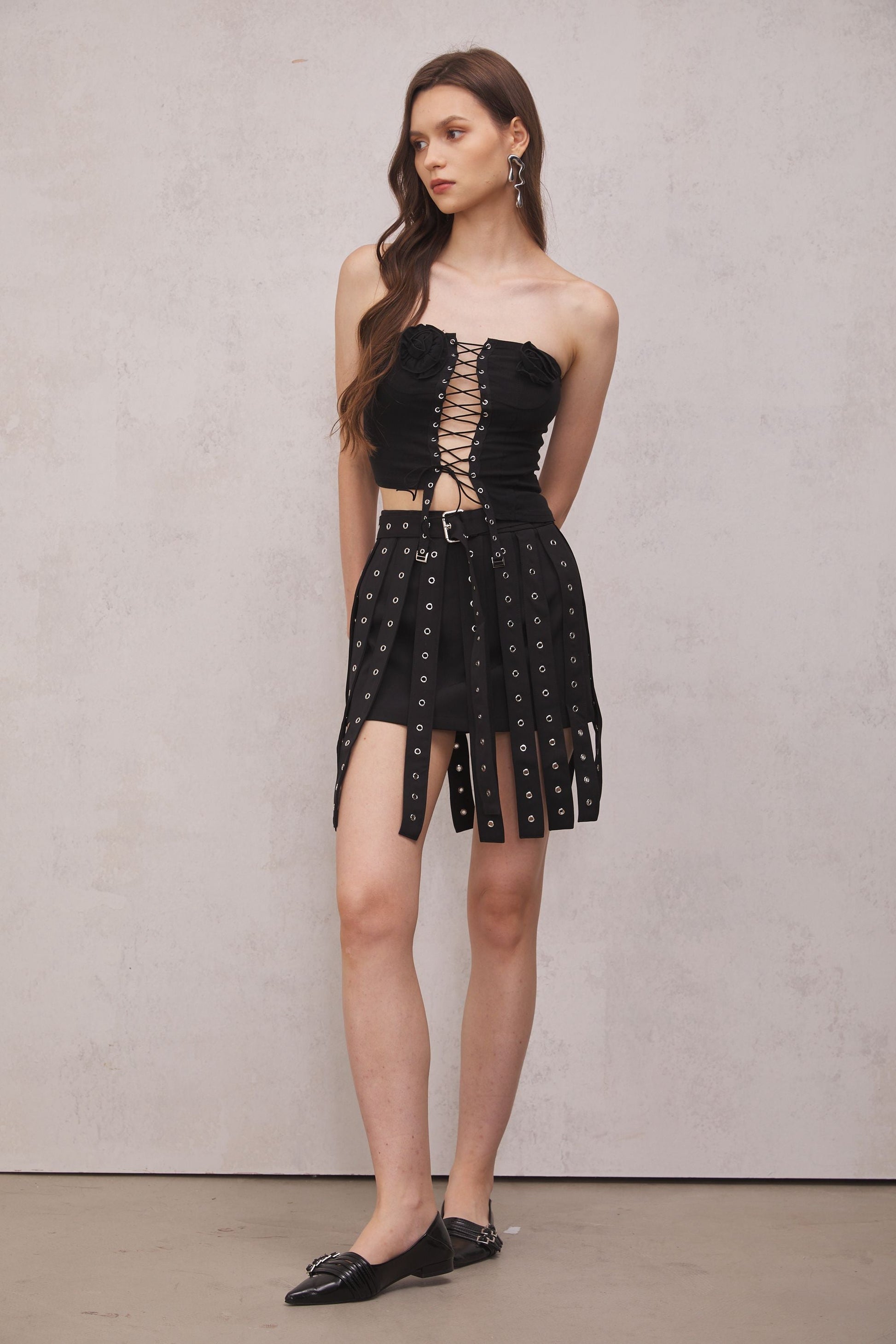 The Sutton Grommet Mini Skirt features a sleek and modern black design with stylish grommet accents. Made with high-quality materials, this mini skirt is perfect for any occasion and will elevate any outfit with its chic and versatile look. A must-have addition to your wardrobe.