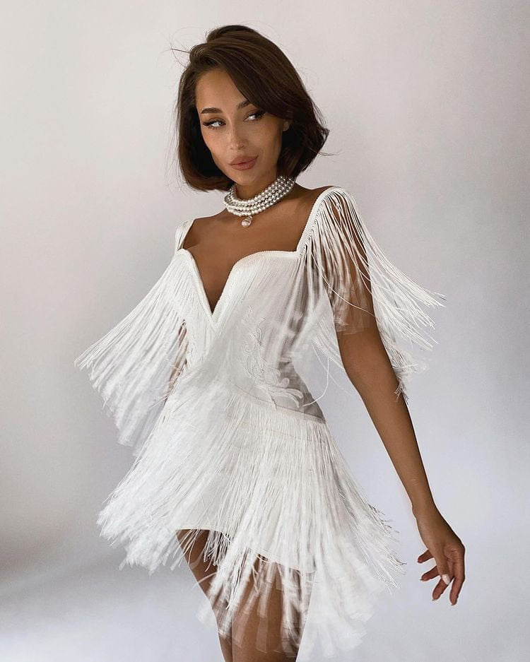Crafted with a flattering plunging neckline, the Tanya Mini Dress is the epitome of style and comfort. Made with a blend of polyester and spandex, it offers a perfect, figure-hugging fit and features playful tassel fringe details. Make a statement with this must-have mini dress!