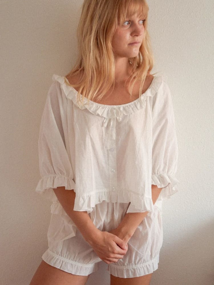 Inspired by romantic victorian sleepwear, the Romeo Sleep Set includes a pair of bloomer-style shorts and a flowy, feminine top; Designed to keep you cool and comfortable during the warmer months. this set features trimmed ruffles, functional buttons, a thin tie around the neckline, and an elastic waist. Wear this set as pajamas or style with a pair of boots or dainty flats for the sweetest daytime look.