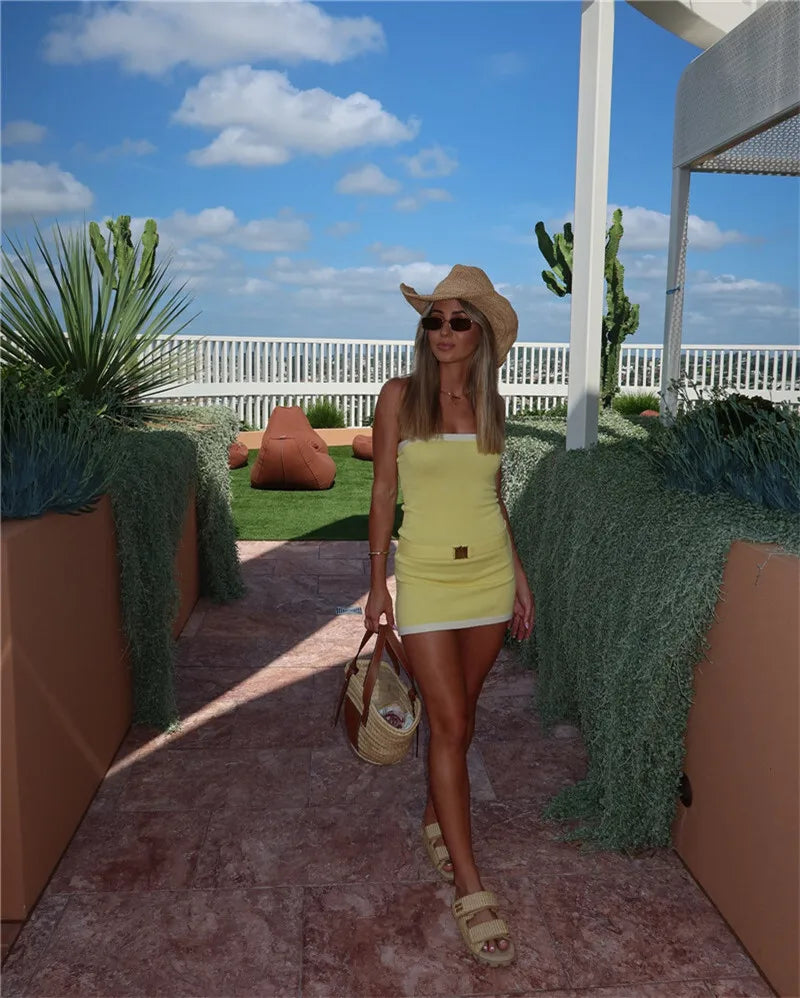 Two-Tone Strapless Ribbed Belt Mini Dress