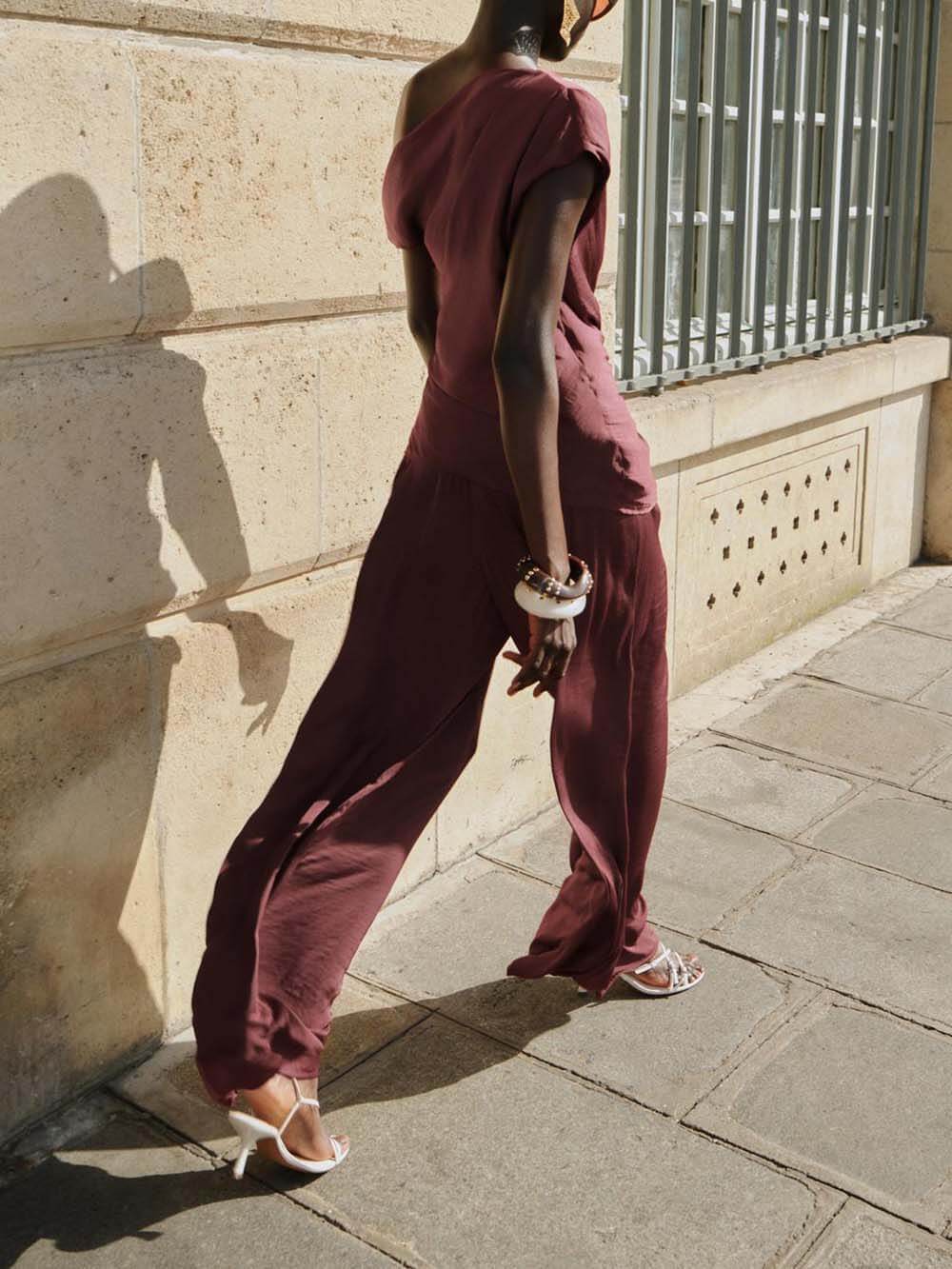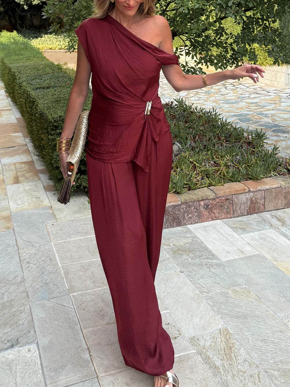 Make a statement with this standout top, featuring an asymmetric hem and eye-catching metallic details. Perfect for adding an edgy, modern touch to your casual or evening looks.