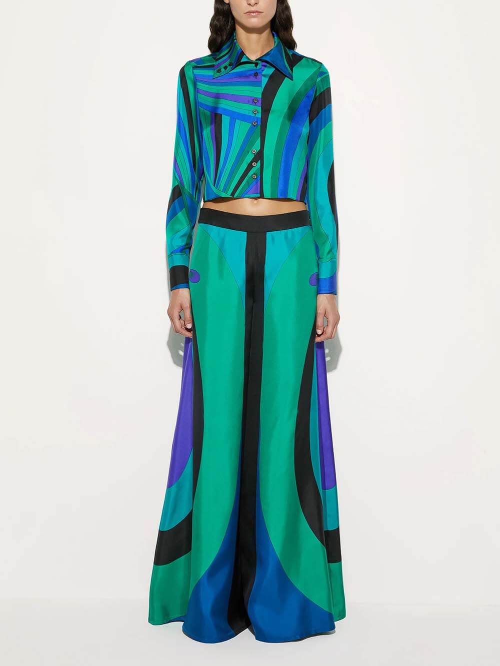 Unique Rainbow Print Cropped Shirt _ Brighten your look with this playful cropped shirt featuring a bold rainbow print. Designed with a modern silhouette and vibrant colors, it adds a cheerful, stylish edge to any outfit. Perfect for pairing with high-waist jeans, skirts, or shorts for a fun, effortless statement.