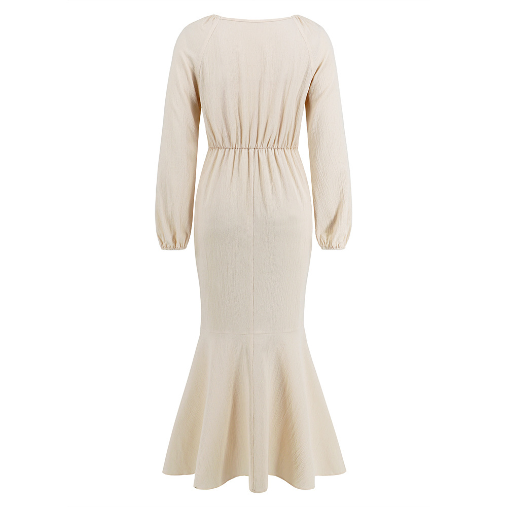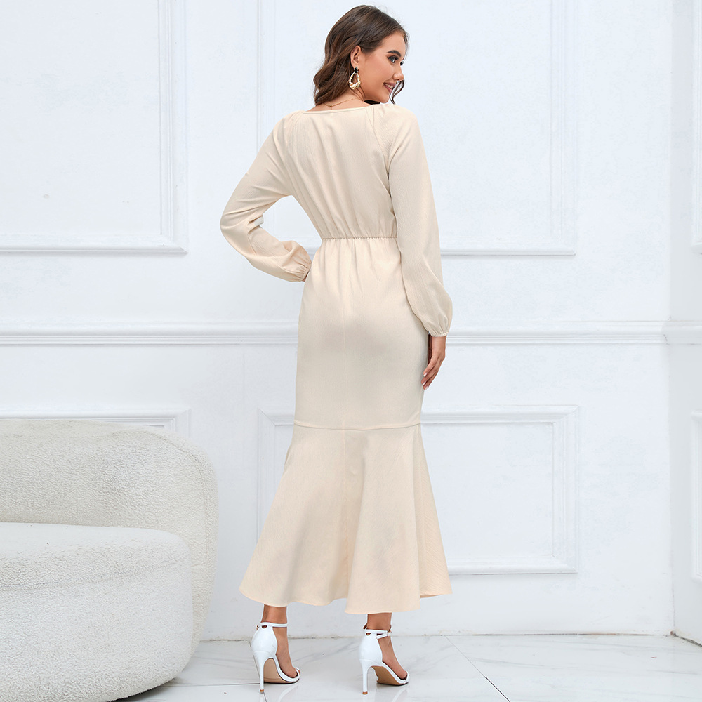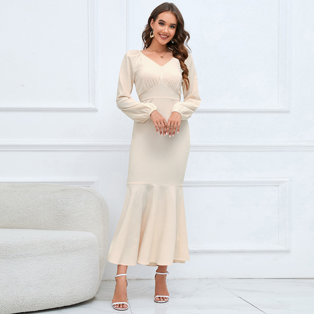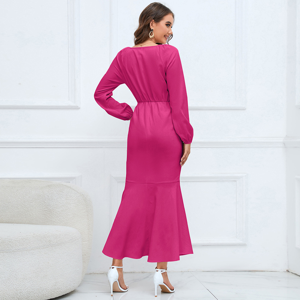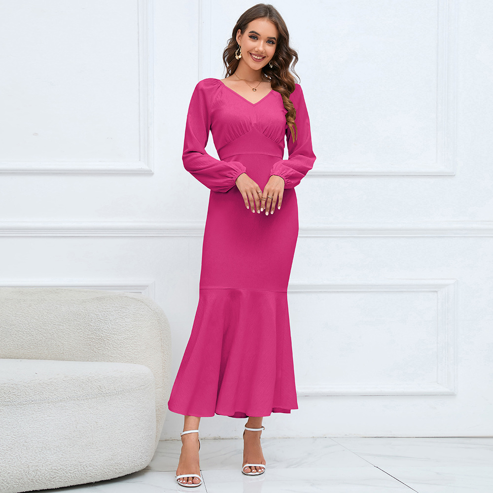 V Neck Long Sleeved Fishtail Dress Waist Slimming Slim Maxi Dress