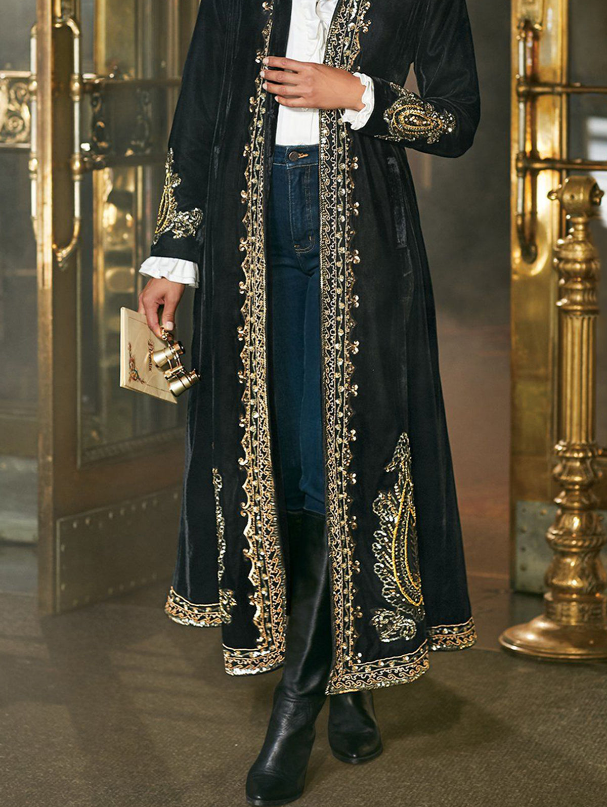 Velvet Stand Collar Geo Pattern Long Sleeve Ankle Length Coat