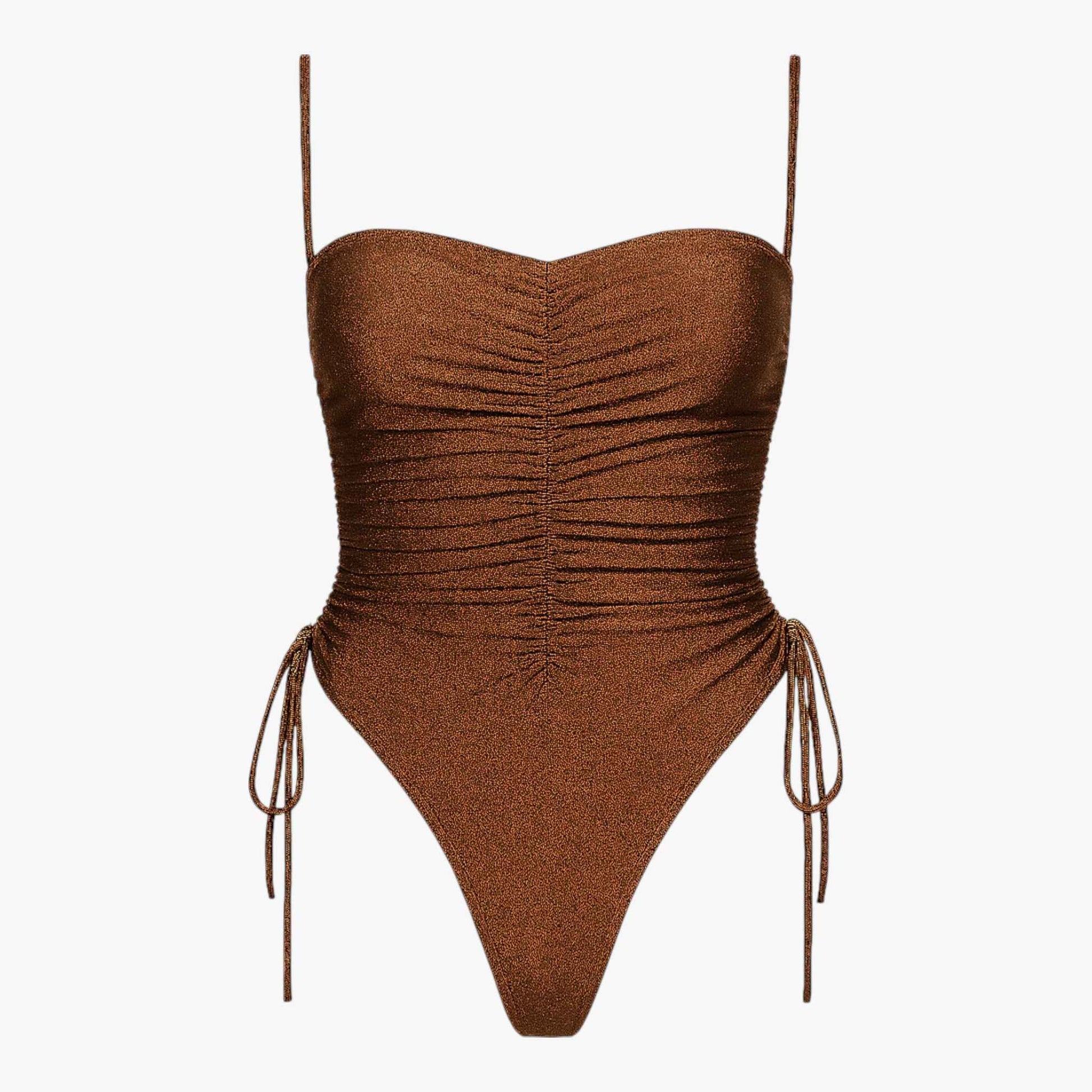 Adjustable shoulder straps allow for a personalised fit, complemented by side drawstrings that subtly contour the waist and hips. The fabric feels smooth and supportive with gentle stretch, offering comfort for long days by the pool or sea. A low back adds ease and lightness without excess.