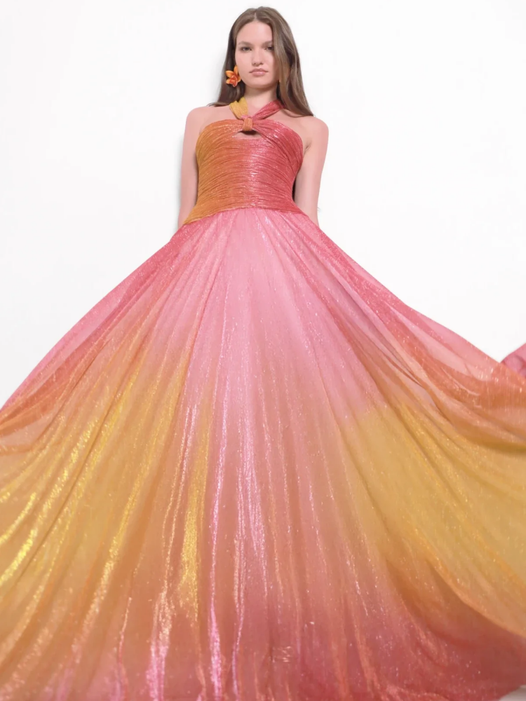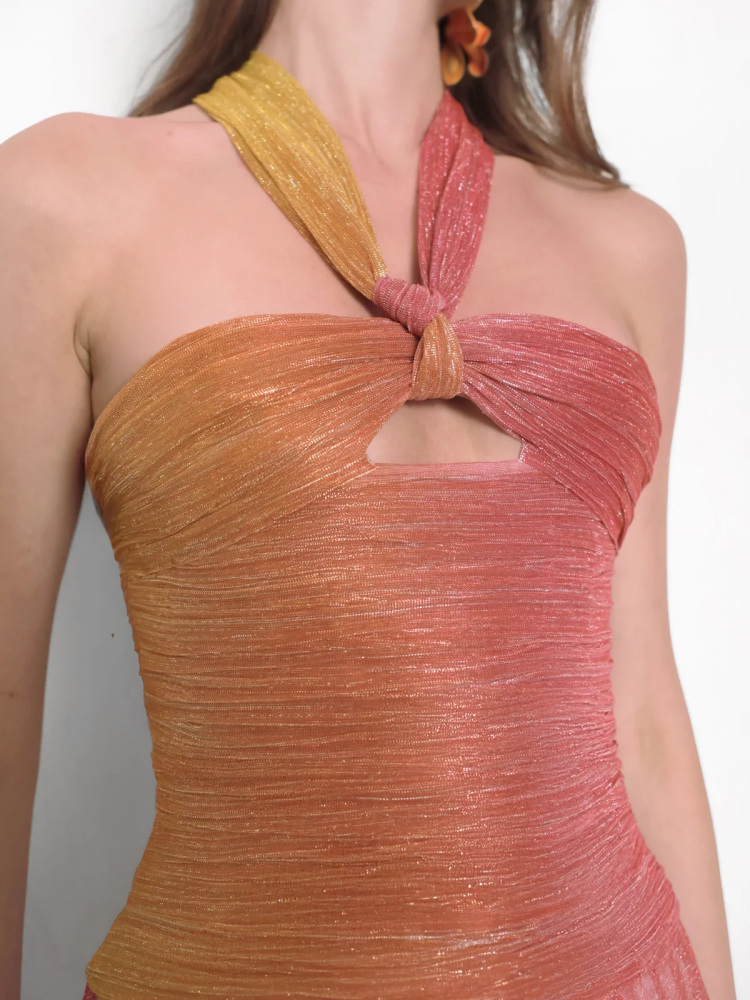 Bold and luminous, the Vrieya Maxi Dress is a statement piece designed to captivate. Featuring a sculpted twist detail at the chest with a defined cutout, this silhouette draws the eye upward to a halter-style strap that wraps gracefully around the neck and trails down the open back. Crafted from a shimmering fabric that fades from yellow to pink, it creates a sophisticated gradient effect that glows with movement. Soft draping at the waist flatters the figure while adding elegance to every step.