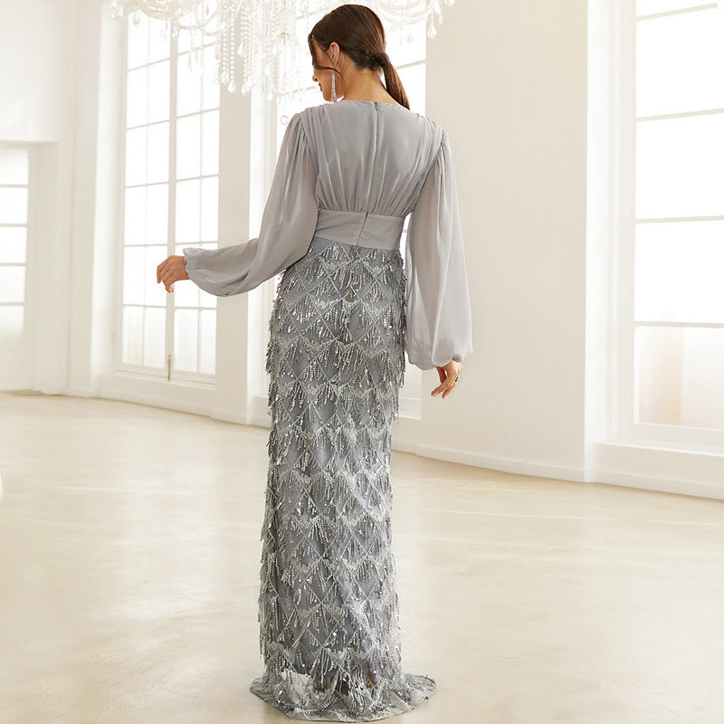 Wedding V-neck Long Sleeve Chinese High-Waist Blue Sequined Tassel Evening Dress for