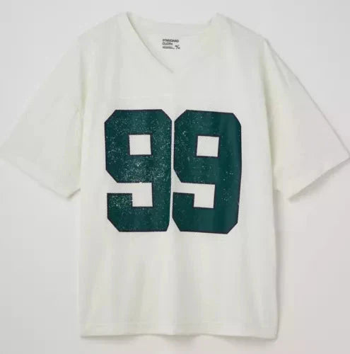 This white jersey t-shirt features a vibrant green '99' graphic print design on the front.
