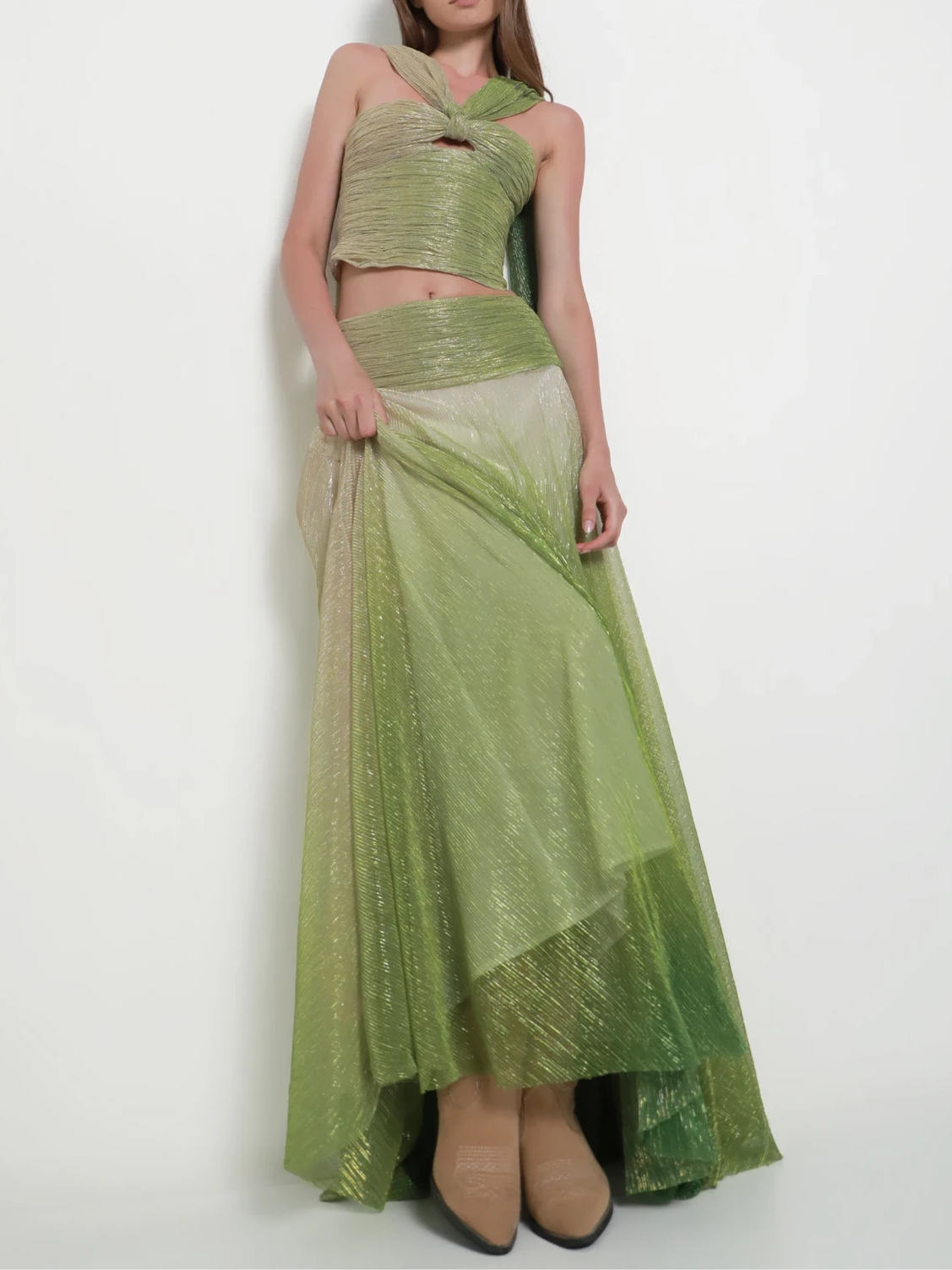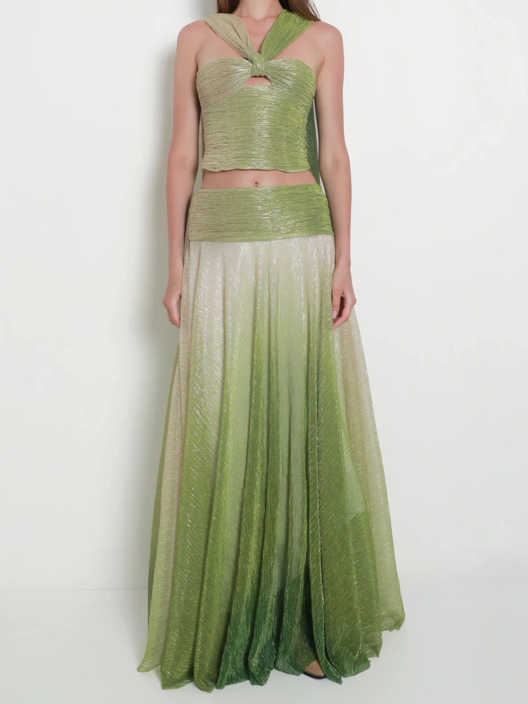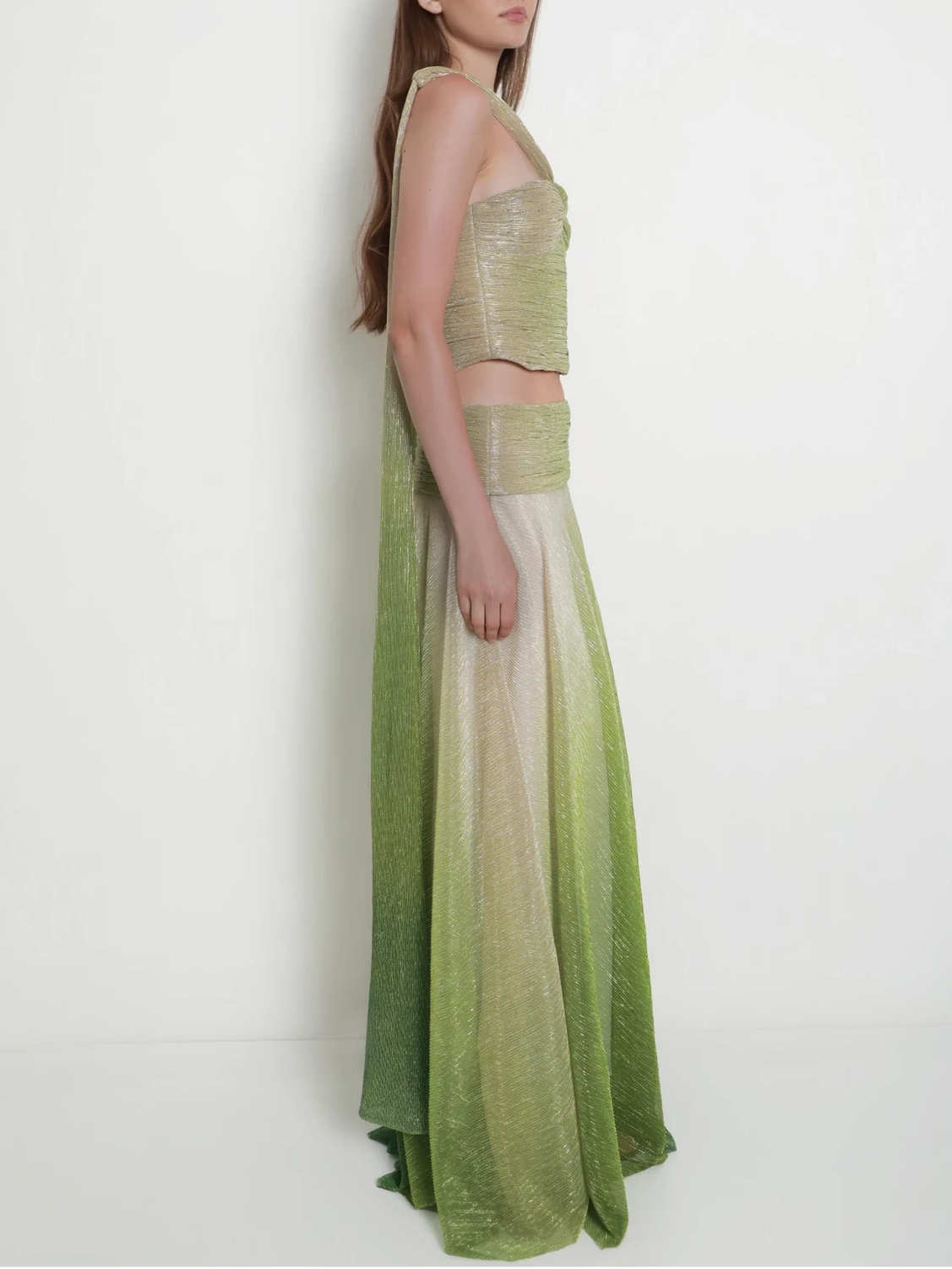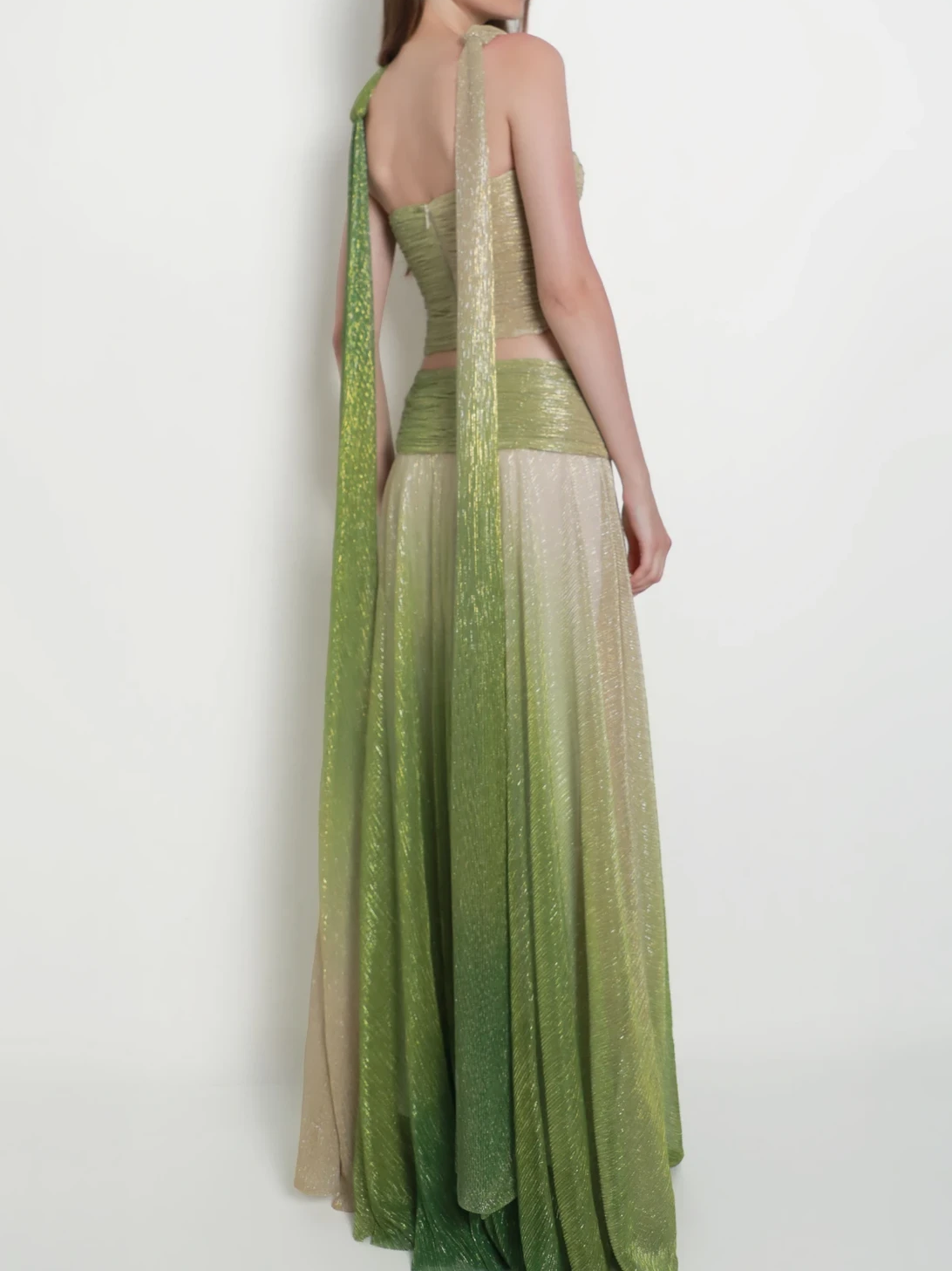 Striking and sculptural, the Zae Set is designed to captivate with its refined draping and fluid ombré finish. The top features a meticulously pleated bust that creates a bold cut-out detail, drawing the eye to a single halter-style strap that wraps gracefully around the neck and flows down the back. Paired with a matching floor-length skirt, the set achieves a cohesive and elevated silhouette.