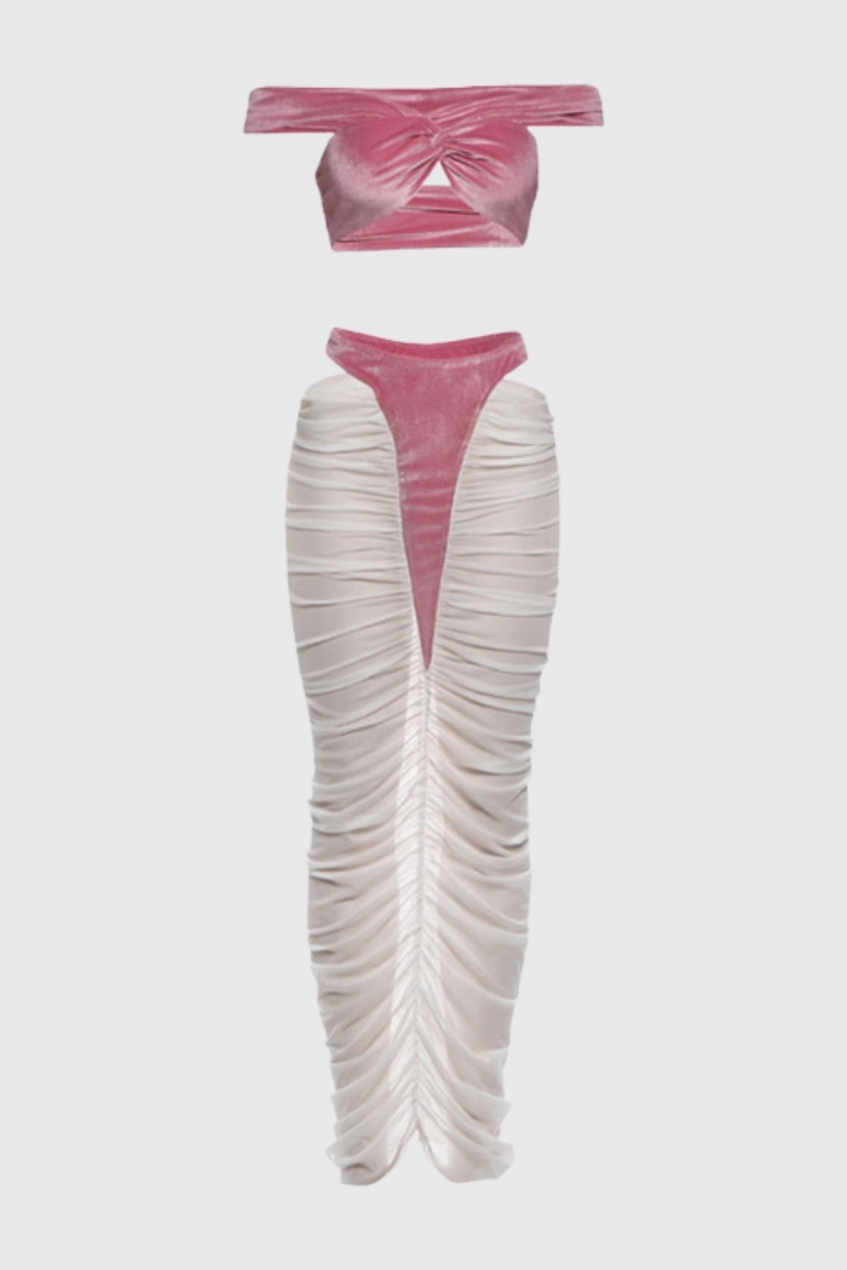 Zeusa Velvet Top & Cutout Mesh Skirt Set - Pink