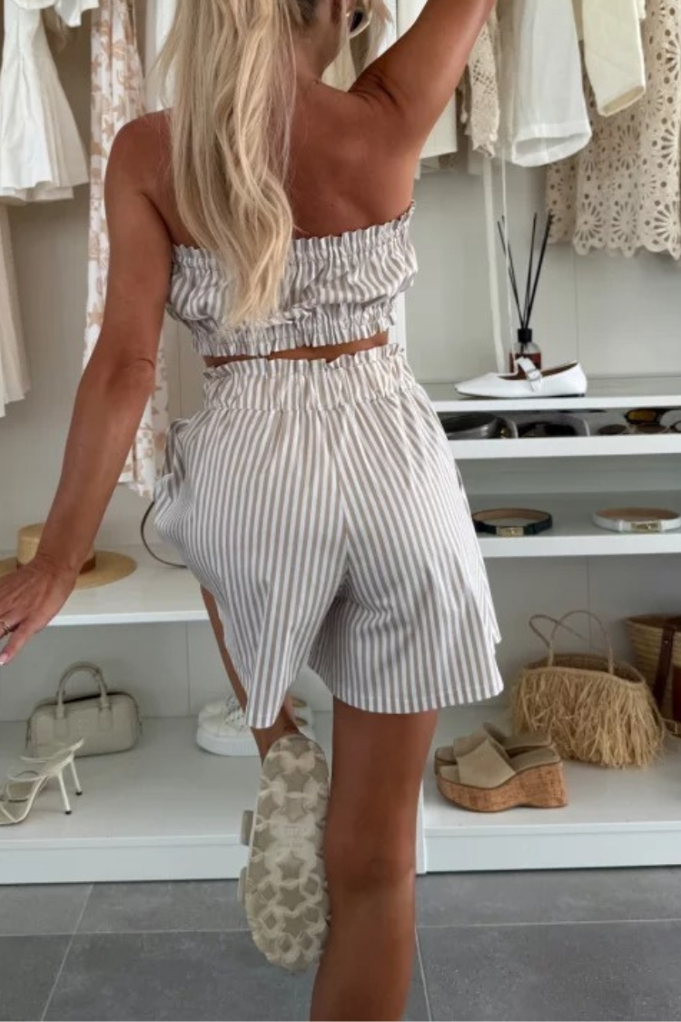 Zoie Striped Stretch Bandeau + Elastic Waist Pocket Shorts + Oversized Blouse 3 Pieces Set